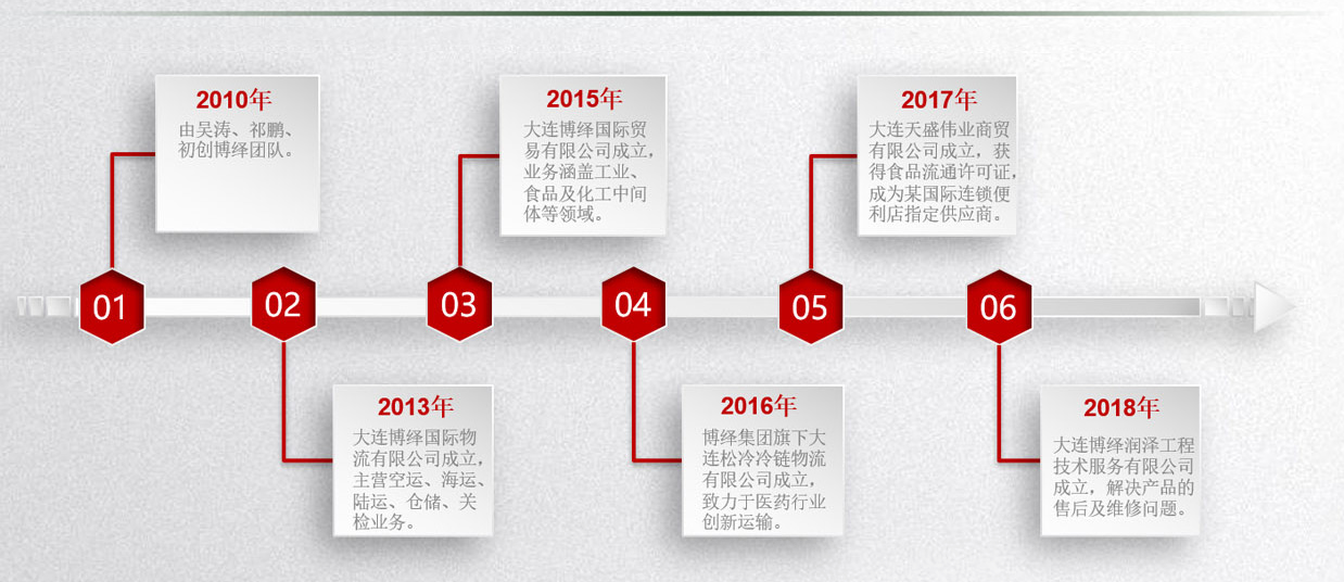 為更好地向客戶提供全球貨物流通服務(wù),集團(tuán)先后成立了大連博繹國(guó)際貿(mào)易有限公司、大連松冷冷鏈物流有限公司、大連天盛偉業(yè)商貿(mào)有限公司及大連博繹潤(rùn)澤工程技術(shù)服務(wù)有限公司。在未來(lái)的發(fā)展中,集團(tuán)將繼續(xù)為客戶提供專(zhuān)業(yè)服務(wù),為員工實(shí)現(xiàn)自我價(jià)值,為社會(huì)和諧發(fā)展和文明進(jìn)步做貢獻(xiàn)。